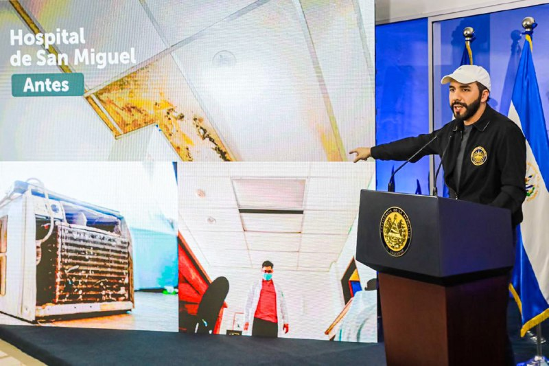 «De los hospitales, solo había un 20 % con áreas de descanso, ese 20 % se adecuó. De ahí, el 80 % de los hospitales no tenía área de descanso» y se construyeron dijo Bukele.