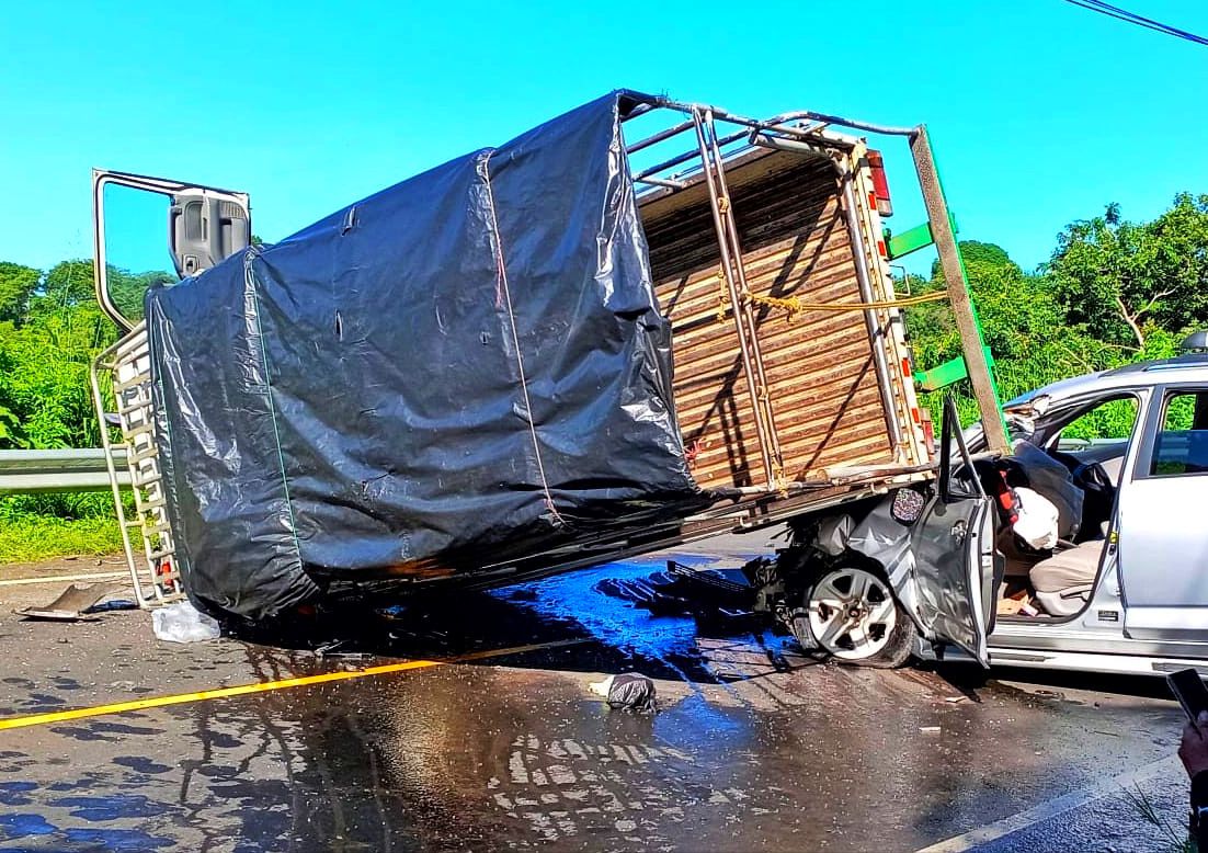 Un accidente de tránsito en el kilómetro 74 de la carretera que conduce de Sonsonate a Salcoatitán dejó como saldo varias personas heridas. El siniestro se produjo luego de que un vehículo particular colisionara contra un camión que transportaba pasajeros, lo cual ocasionó que este volcara.