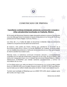 A través de un comunicado oficial, el Ministerio de Relaciones Exteriores informó que continúan brindando protección consular a las niñas salvadoreñas localizadas en Coahuila, México, el pasado 11 de enero en las riberas del Río Bravo.
