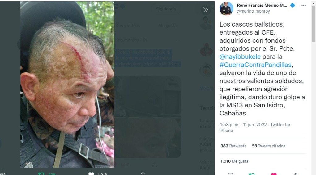 La información fue proporcionada por el ministro de Defensa, Francis Merino Monroy en su cuenta de Twitter. “Los cascos balísticos, entregados al CFE y adquiridos con fondos otorgados por el presidente Nayib Bukele, para la guerra contra las pandillas, ahora (uno de estos) salvó la vida de uno de nuestros valientes soldados que repelieron la agresión de los pandilleros que se encontraban en ese campamento», manifestó el jefe militar. «Hoy hemos dado un duro golpe a la MS-13 en San Isidro, Cabañas”, puntualizó el funcionario.