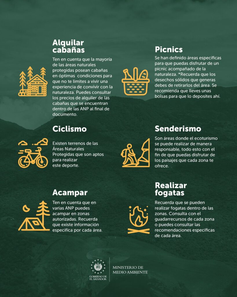 Las autoridades piden a los salvadoreños seguir las recomendaciones de no alterar el medio ambiente ni dejar basura, así como respetar la fauna silvestre.