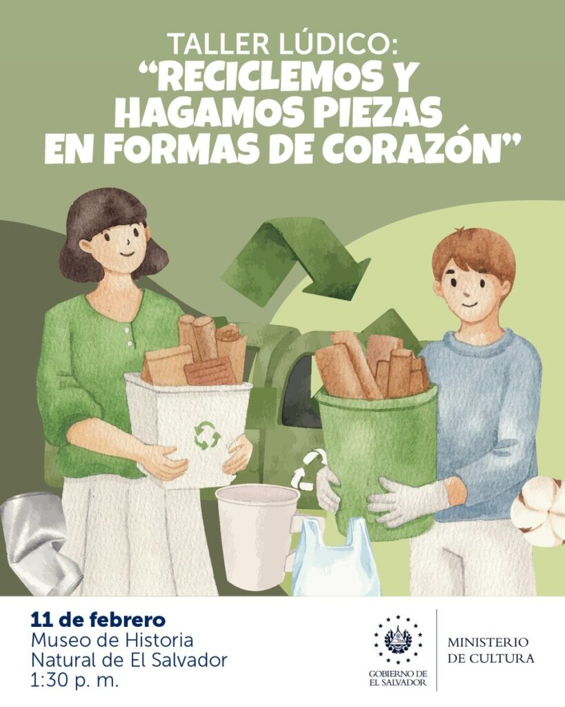 Asimismo, el Museo de Historia Natural de El Salvador, ubicado al interior del Parque Saburo Hirao, invita a la población a participar en el taller “Reciclemos y Hagamos Piezas en Formas de Corazón”, que se llevará a cabo el domingo 11 de febrero a la 1:30 p.m.