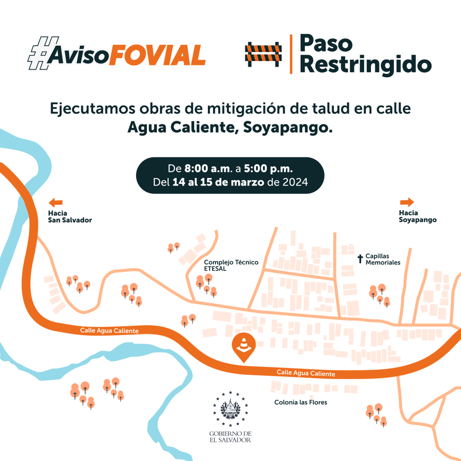 El Fondo de Conservación Vial (Fovial) restringirá el paso en la calle a Agua Caliente de Soyapango los días 14 y 15 de marzo, por trabajos de mitigación en la zona.