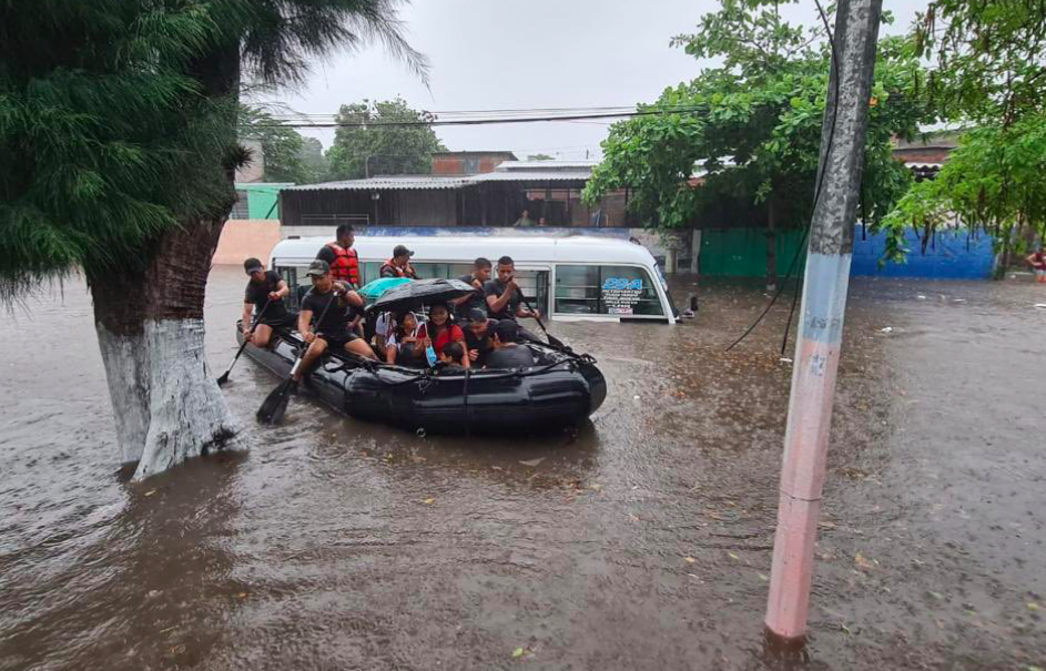 Esta tarde, elementos de la Fuerza Área, rescataron y evacuaron a pasajeros de un microbús que se inundó y quedó atrapado debido a las lluvias en la colonia Santa Lucía, de Ilopango.
