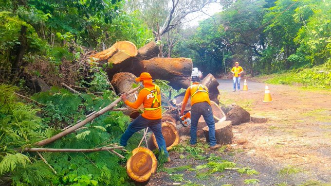 En las primeras horas de este sábado se informó sobre la caída de un árbol, por lo que personal del Fondo de Conservación Vial (FOVIAL), Bomberos de El Salvador y lugareños, trabajaron de forma articulada para retirar el árbol en su totalidad.