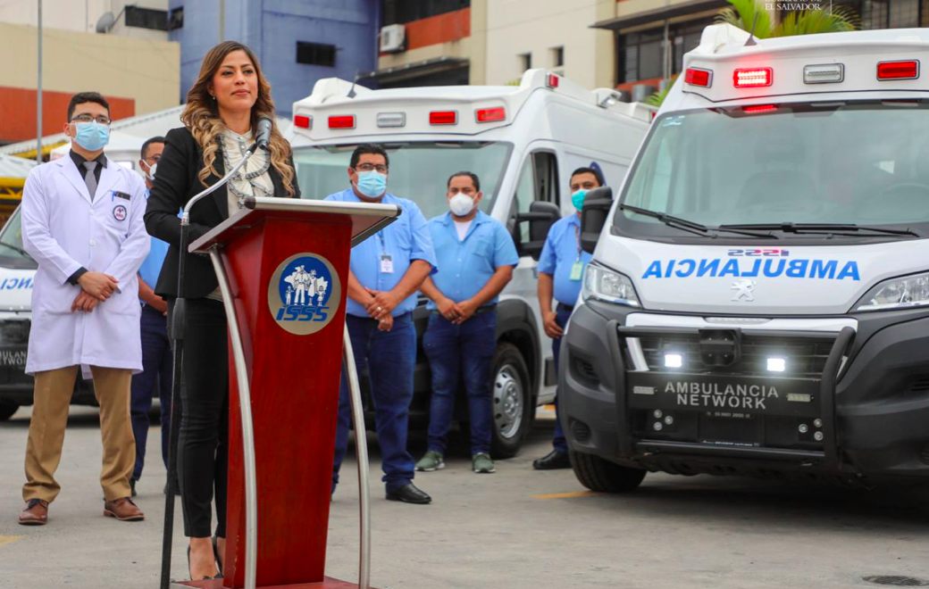 La directora del Instituto Salvadoreño del Seguro Social (ISSS), Mónica Ayala, entregó esta tarde nuevas ambulancias tipo A-UCI a diferentes centros de atención del ISSS, la idea, según la funcionaria, es fortalecer la flota institucional actual y mejorar la atención en el traslado de pacientes, así como la capacidad de respuesta para emergencias criticas.