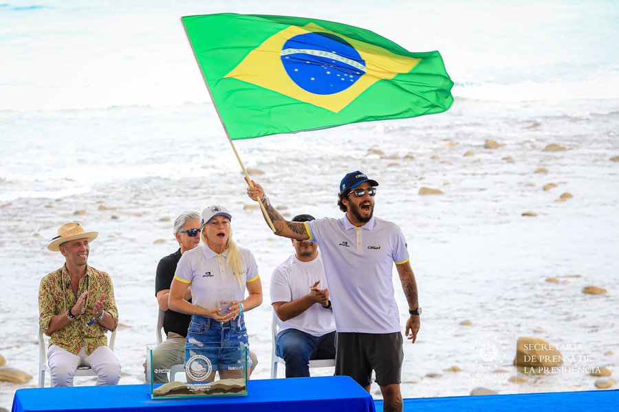 Turismo, Morena Valdez, y el titular de la ISA surfing, Fernando Aguerre.