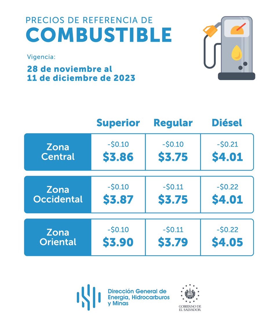 La gasolina Súper y regular reflejan una reducción del $0.10 y $0.11 ctvs., y el diésel $0.22 y $0.21 ctvs., cuyos precios entrarán en vigencia del 28 de noviembre a 11 de diciembre de 2023.