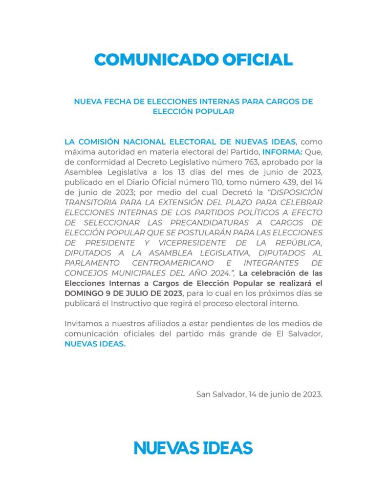 “Invitamos a nuestros afiliados a estar pendientes de los medios de comunicación oficiales del partido más grande El Salvador”, se lee en el comunicado.
