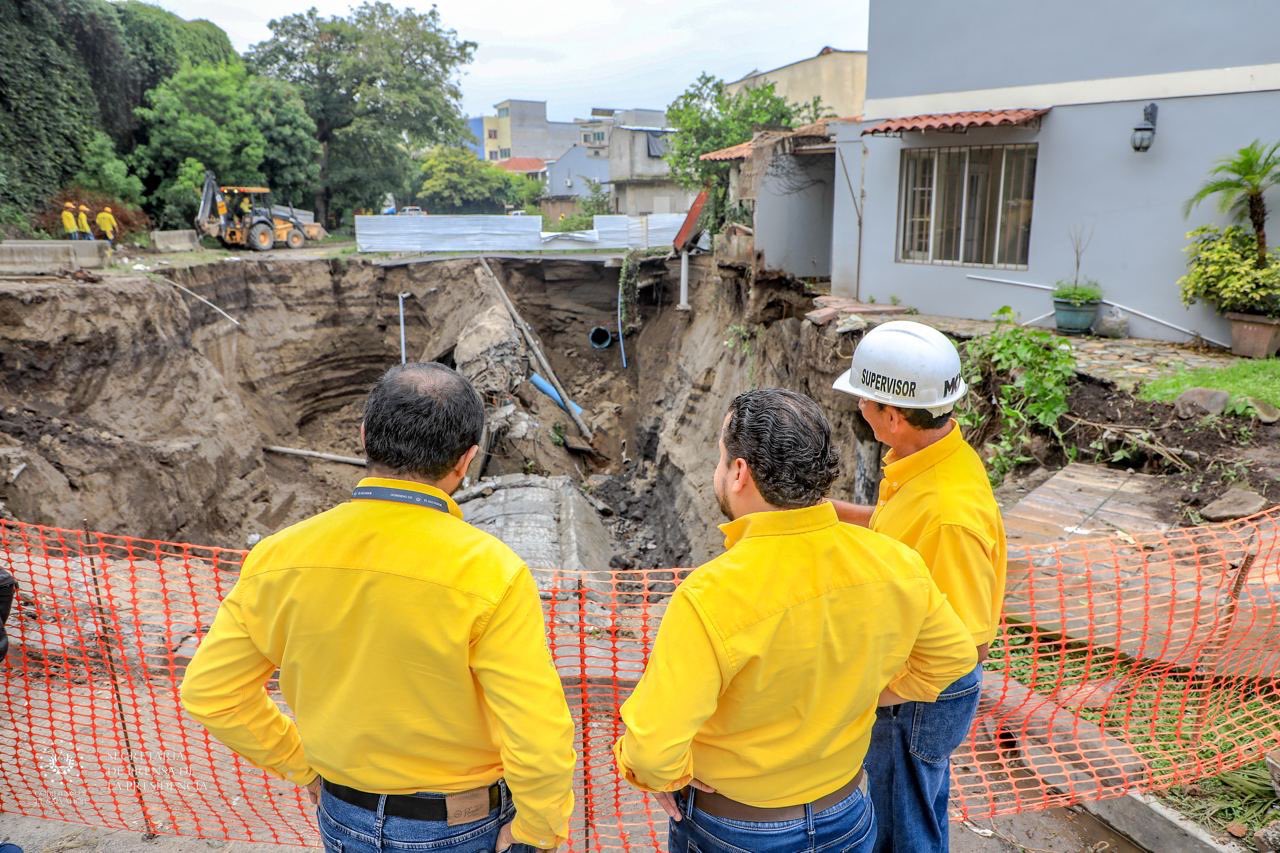 Con el objetivo de brindar un solución definitiva, el ministro de Obras Públicas, Romeo Rodríguez, se hace presente a la residencial Brisas de San Francisco, en San Salvador, para verificar los trabajos en la cárcava, tras el colapso de una bóveda, producto de las intensas lluvias el día jueves.