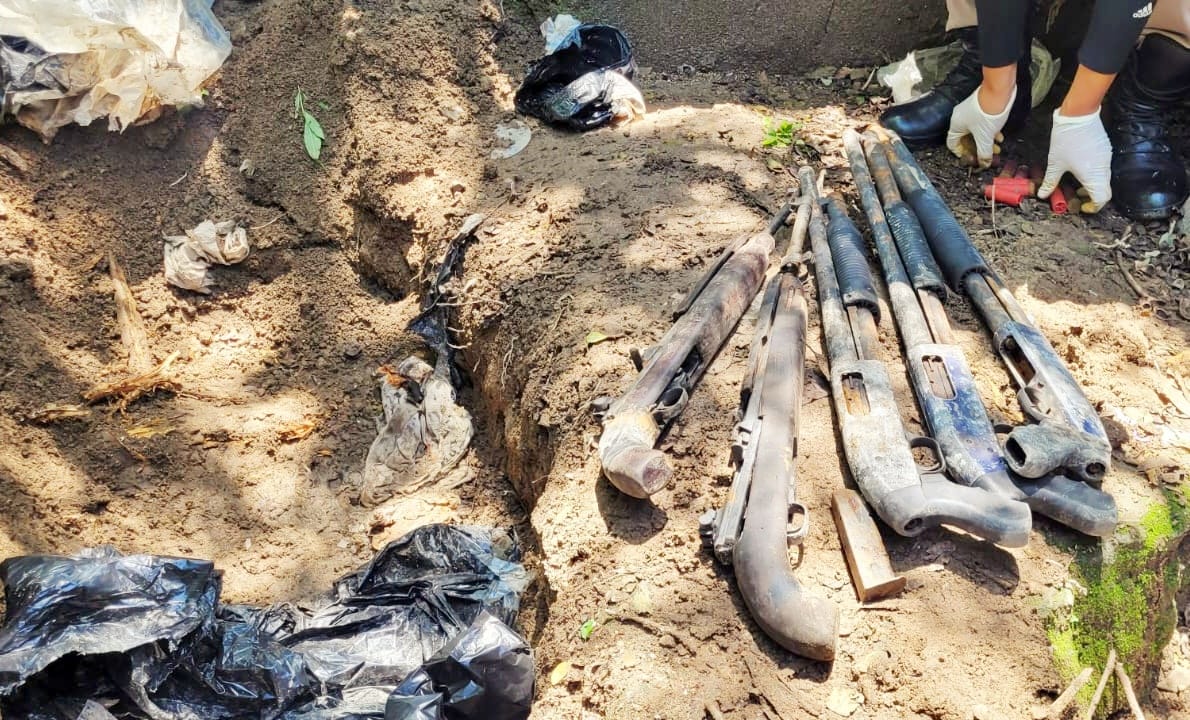 El armamento encontrado consiste en tres escopetas 12mm, dos carabinas 30-30, 197 cartuchos para fusil, 54 cartuchos para pistola y 10 cartuchos para escopeta.