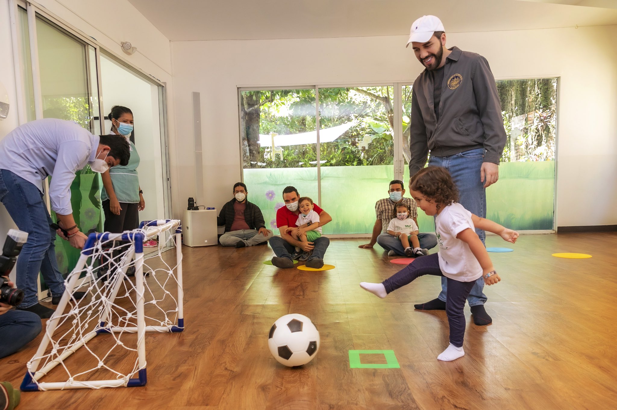 En unas de las imágenes se puede observar cómo Bukele acompaña a Layla en sus rutinas del centro de educación inicial, que busca fomentar la atención profesional, sistemática, organizada y fundamentada.