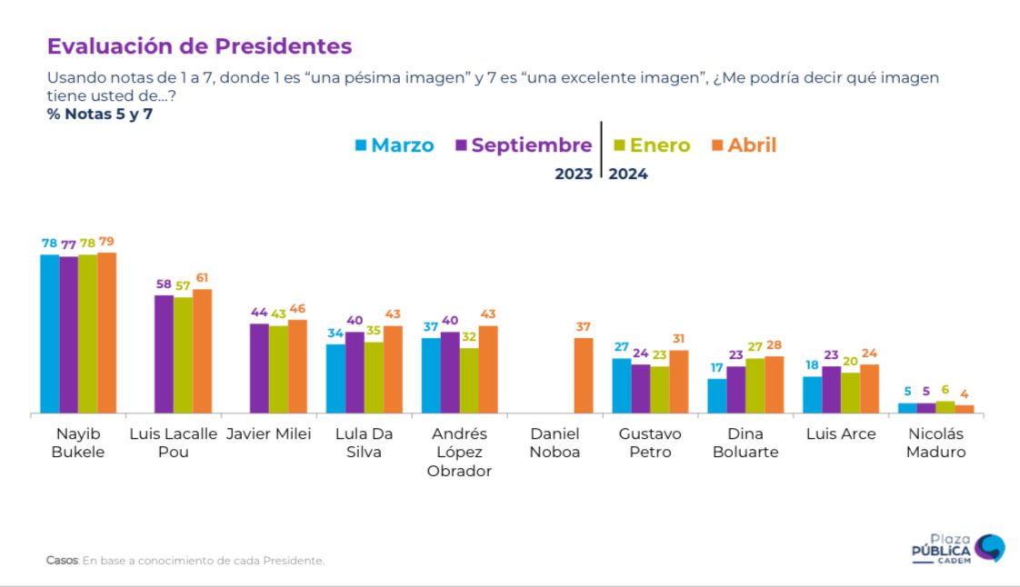De acuerdo con los resultados, el mandatario salvadoreño figura en el primer lugar con un 79 % de evaluación, seguido por el mandatario de Uruguay, Luis Lacalle Pou (61 %) y Javier Milei, de Argentina (46 %).