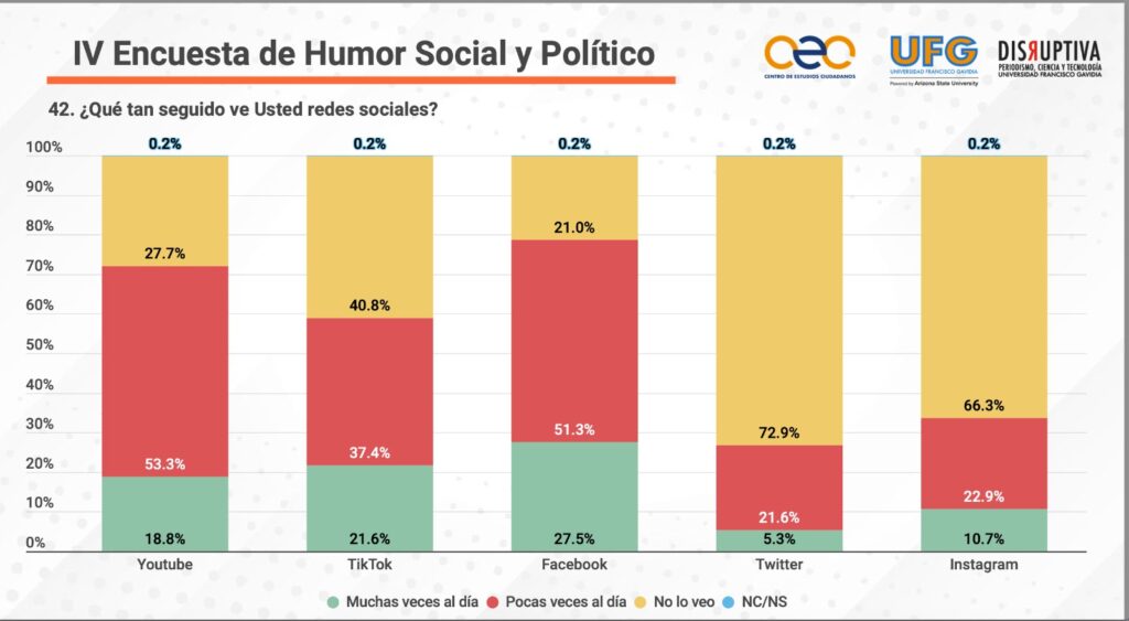 Las redes sociales más utilizadas por los salvadoreños son Facebook con un 78.8 %; 72.1 % YouTube y 59 % TikTok, de acuerdo con la IV Encuesta de Humor Social y Político Decodificación Axiológica del Centro de Estudios Ciudadanos (CEC) de la Universidad Francisco Gavidia (UFG).