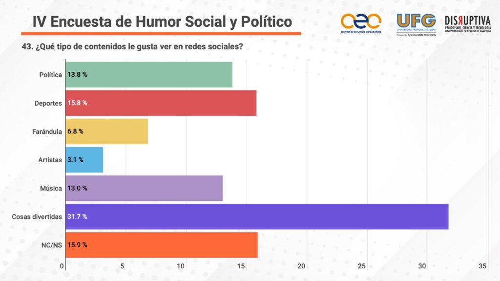 Sobre el contenido que consume en redes, la mayoría de salvadoreños las utiliza para ver contenido divertido, luego para ver deportes y después para ver contenido político.