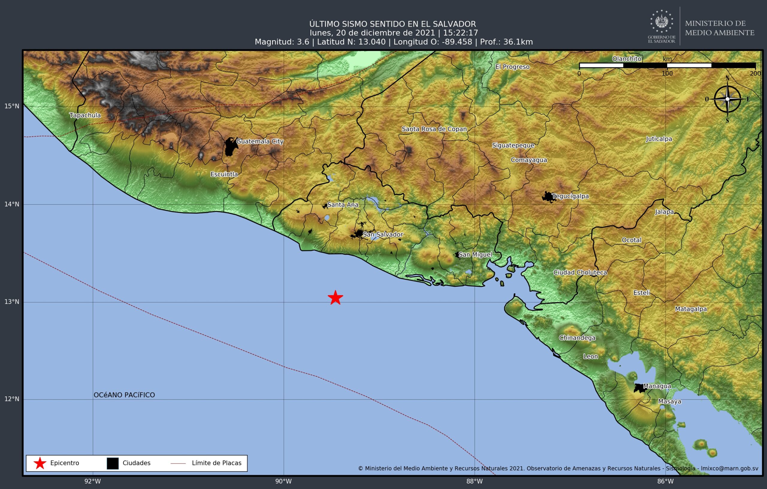 El Ministerio de Medio Ambiente y Recursos Naturales (MARN) la tarde de este lunes confirmó un sismo de magnitud 3.6 en la escala de Richter frente a la costa de La Libertad, sin que entidades de socorro reportaran emergencias.