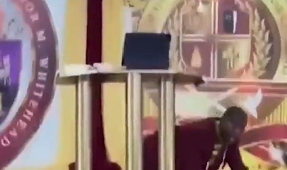 En el video se aprecia que Lamor Miller-Whitehead estaba en su discurso cuando un grupo de sujetos invadió la iglesia, le amenazaron con armas de fuego y le sustrajeron hasta $1 millón en joyas a él y a su esposa.