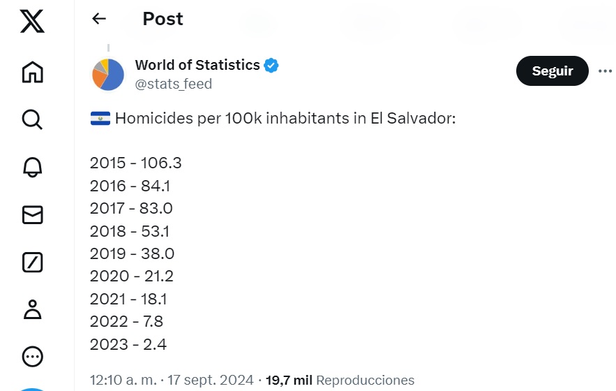 De acuerdo con @stats_feed, la cifra de homicidios viene bajando drásticamente desde que tomó posesión del gobierno el mandatario salvadoreño en el 2019, en el 2023 cerró 2.4 por cada 100 mil habitantes.