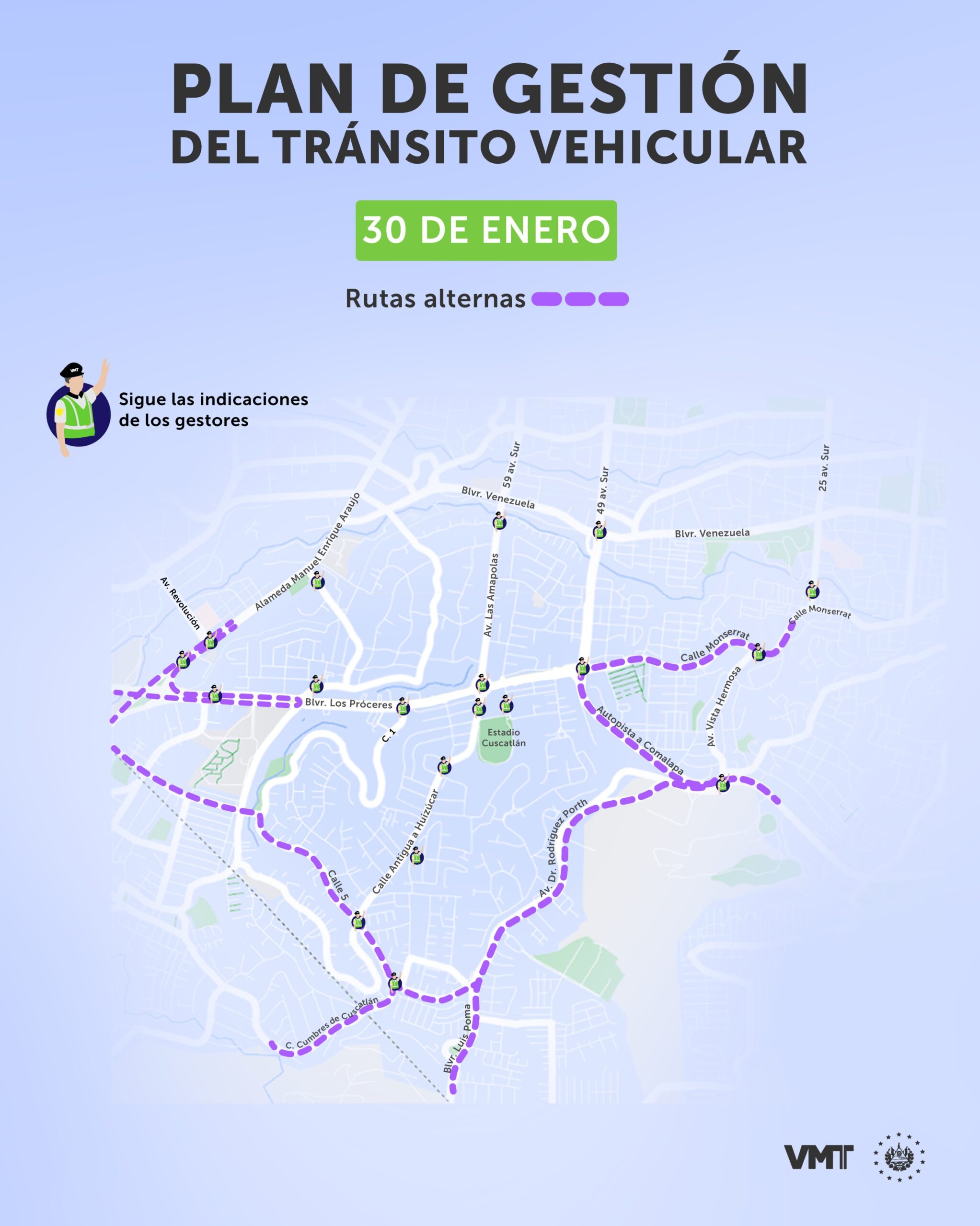 El viceministro indicó que han desplegado a 200 gestores de tránsito en los alrededores del estadio. El despliegue incluye las vías alternas como el bulevar Monseñor Romero, la alameda Manuel Enrique Araujo y el bulevar Luis Poma.