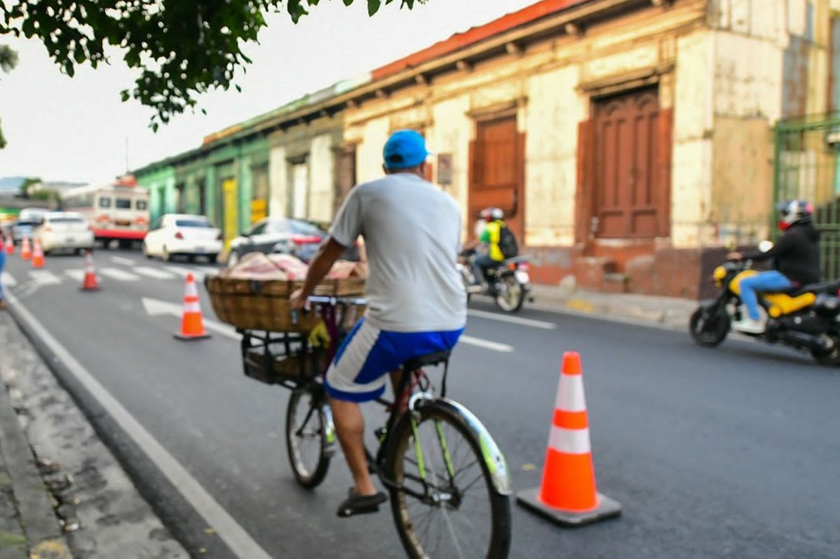 Por segundo día consecutivo, autoridades del Vice Ministerio de Transporte (VMT), realizan la prueba piloto de la ciclovía en el barrio San Jacinto, en San Salvador, a través de un reordenamiento vial y restar carriles a los vehículos.